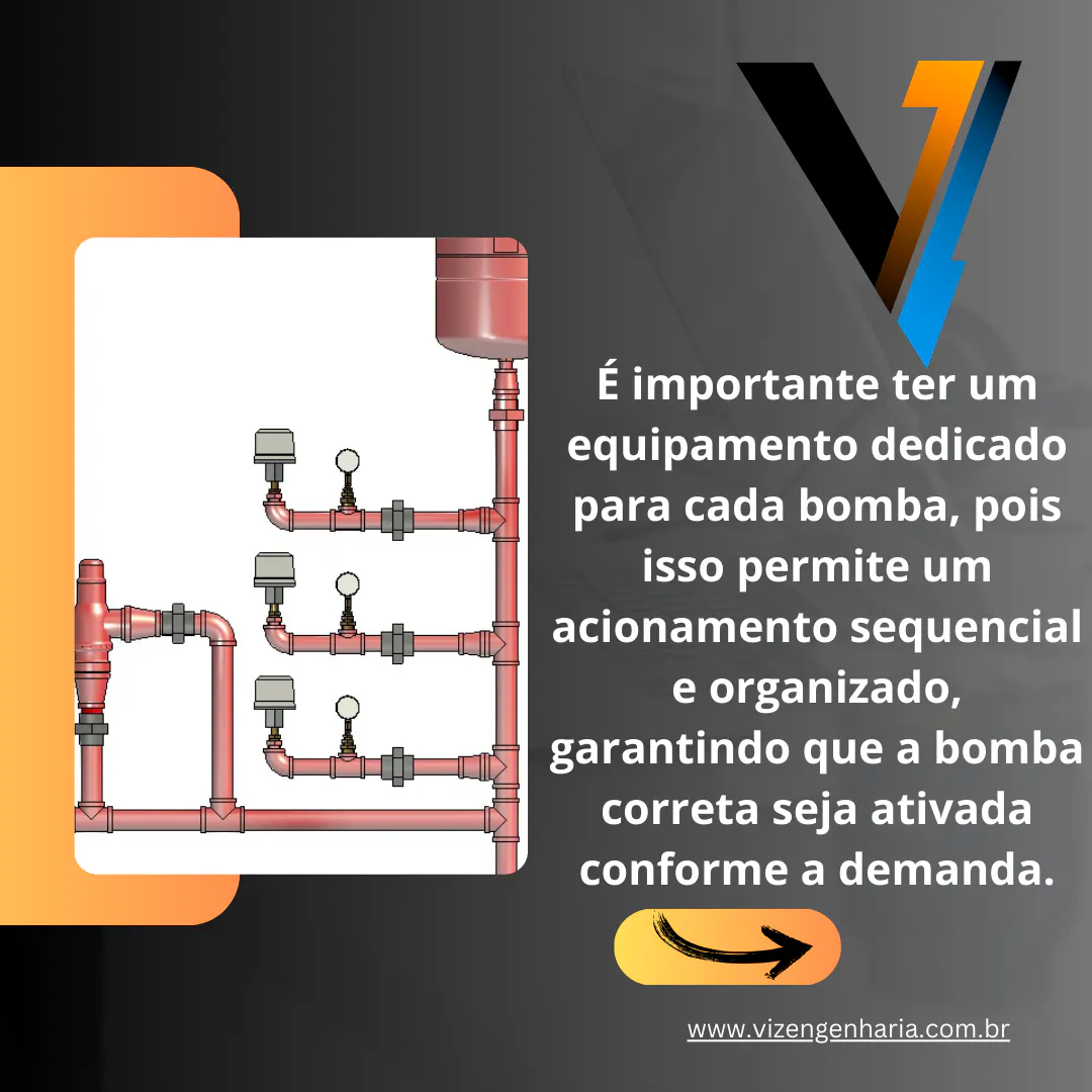 O pressostato monitora a pressão na tubulação e aciona a bomba auxiliar (jockey) ou a bomba principal automaticamente ao detectar uma queda de pressão causada pelo uso dos hidrantes ou sprinklers. Ter um pressostato dedicado para cada bomba é importante para que o acionamento seja sequencial e organizado, evitando sobrecarga do sistema e garantindo que a bomba correta seja ativada de acordo com a demanda.